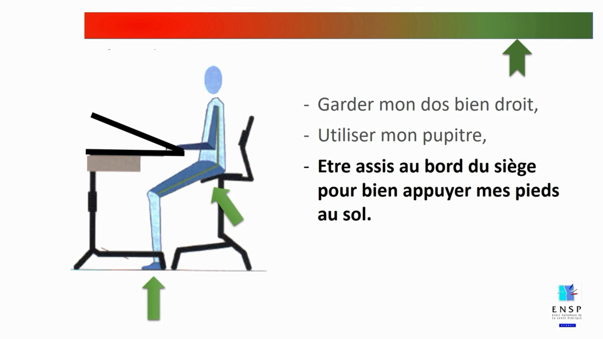 Le maintien de bonnes positions pour le travail sur un bureau (lecture sur un plan incliné à 30°) est essentiel.