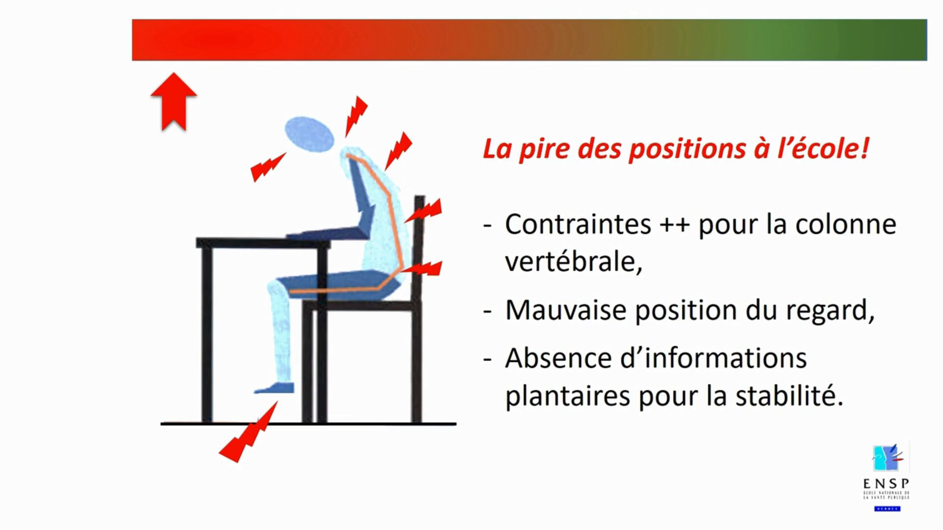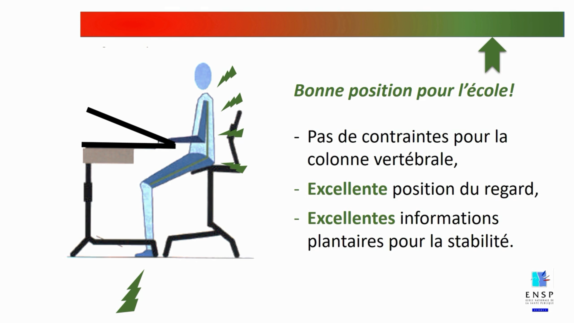 Le maintien de bonnes positions pour le travail sur un bureau (lecture sur un plan incliné à 30°) est essentiel.